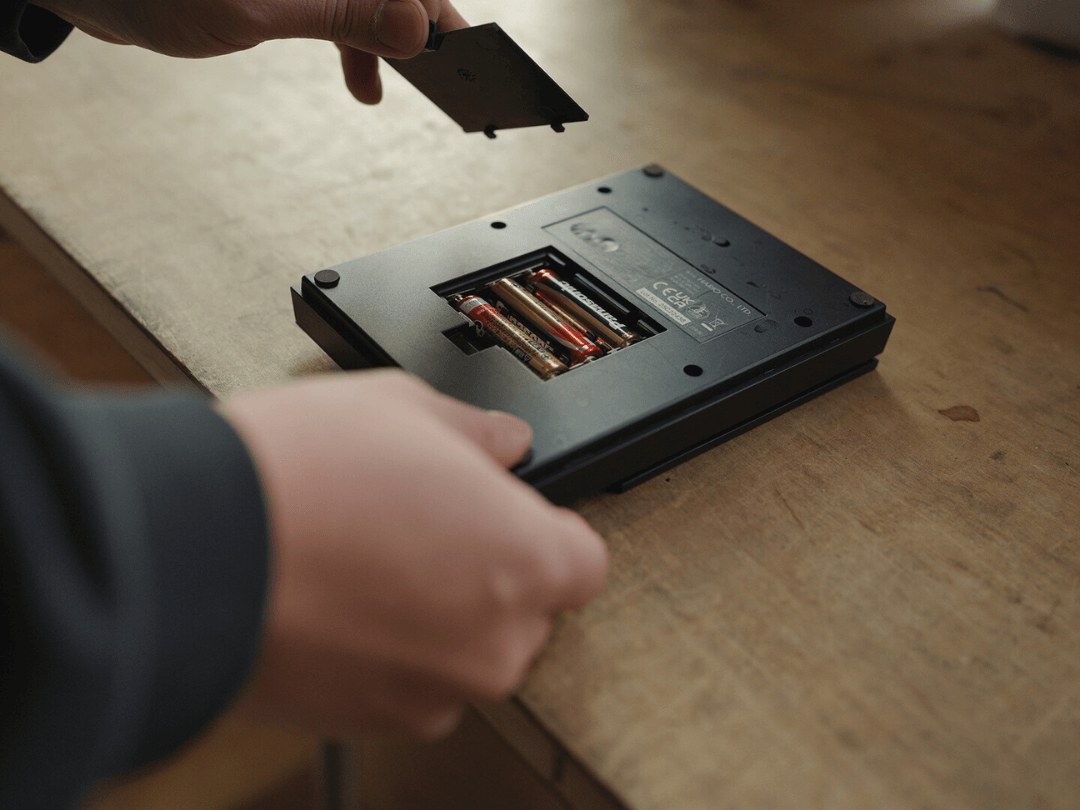 最近のコーヒースケールはUSB充電式が一般化している気がするけど、ポラリスは単三型乾電池3本で駆動。主電源はなし。